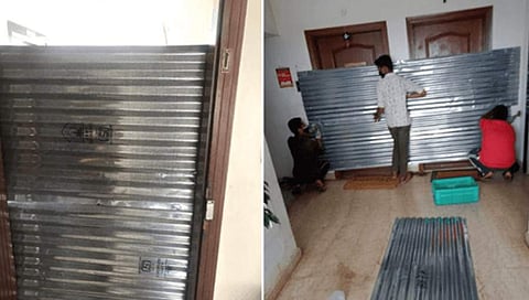 ಬೆಂಗಳೂರು: ದೊಮ್ಮಲೂರಿನ ಅಪಾರ್ಟ್'ಮೆಂಟ್ ವೊಂದರಲ್ಲಿ ವ್ಯಕ್ತಿಯೊಬ್ಬರಿಗೆ ಕೊರೋನಾ ಪಾಸಿಟಿವ್ ಬಂದ ಹಿನ್ನೆಲೆಯಲ್ಲಿ ಮನೆ ಬಾಗಿಲಿಗೇ ಕಬ್ಬಿಣದ ಶೀಟ್ ಹೊಡೆಯುವ ಮೂಲಕ ಸೀಲ್ಡೌನ್ ಮಾಡಿದ್ದ ಬಿಬಿಎಂಪಿ ಅಧಿಕಾರಿಗಳ ವಿರುದ್ಧ ಸಾರ್ವಜನಿಕುರು ತೀವ್ರ ಕಿಡಿಕಾರಲು ಆರಂಭಿಸಿದ್ದಾರೆ.