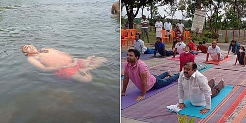 ಶ್ರೀರಂಗಪಟ್ಟಣ: ಇಲ್ಲಿಗೆ ಸಮೀಪದ ಚಂದ್ರವನ ಆಶ್ರಮದ ಪೀಠಾಧ್ಯಕ್ಷ ತ್ರಿನೇತ್ರ ಮಹಾಂತ ಶಿವಯೋಗಿ ಸ್ವಾಮೀಜಿ ಭಾನುವಾರ ವಿಶ್ವ ಯೋಗ ದಿನಾಚರಣೆಯ ಅಂಗವಾಗಿ ಯೋಗ ಜಲ ಯೋಗ ಪ್ರದರ್ಶಿಸಿದರು.