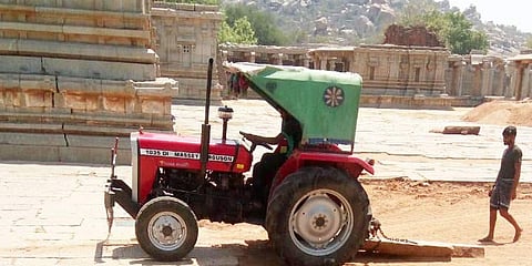 ಗುತ್ತಿಗೆದಾರ ಬೇಕಾ ಬಿಟ್ಟಿಯಾಗಿ ಕಾಮಗಾರಿ ನಡೆಸುತಿದ್ದರೂ ಭಾರತೀಯ ಪುರಾತತ್ವ ಇಲಾಖೆ ಮಾತ್ರ ಕಣ್ಣು ಮುಚ್ಚಿ ಕುಳಿತಿದೆ. ಹಂಪಿಯ ವಿಜಯ ವಿಠ್ಠಲ ದೇವಸ್ಥಾನದ ಸಂಕೀರ್ಣದಲ್ಲಿ ಟ್ರಾಕ್ಟರ್ ನುಗ್ಗಿಸಿ ಕಾಮಗಾರಿ ನಡೆಸಲಾಗುತ್ತಿದೆ. ನಿಯಮದ ಪ್ರಕಾರ ಸ್ಮಾರಕಗಳ ಮದ್ಯೆ ಯಾವುದೇ ಬಾರಿ ಯಂತ್ರೋಪಕರಣಗಳ ಬಳಕೆಮಾಡದಂತೆ ಕಾಮಗಾರಿ ನಡೆಸಬೇಕು. ಬಾರಿ ಯಂತ್ರೋಪಕರಣಗಳನ್ನು ಬಳಕೆ ಮಾಡಿದರೆ ಸ್ಮಾರಕಗಳ ಮೂಲ ಸ್ವರೂಪಕ್ಕೆ ಧಕ್ಕೆಯಾಗುವ ಸಾಧ್ಯತೆ ಹೆಚ್ಚಿರುತ್ತದೆ.