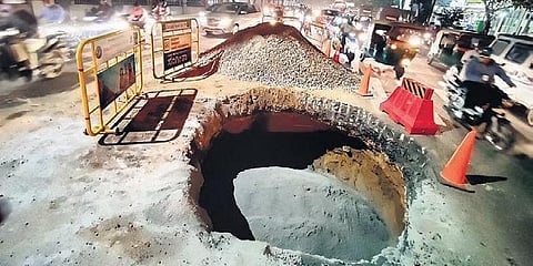 ಬೆಂಗಳೂರು: ನಗರದ ಪ್ರಮುಖ ರಸ್ತೆಯೊಂದರಲ್ಲಿ ಇದ್ದಕ್ಕಿದ್ದಂತೆ ಭೂಮಿ ಕುಸಿದು ಗುಂಡಿ ನಿರ್ಮಾಣವಾದ ಪರಿಣಾಮ ಭಾರೀ ಪ್ರಮಾಣ ಸಂಚಾರ ದಟ್ಟಣೆ ಎದುರಾಗಿ ವಾಹನ ಸವಾರರು ಹೈರಾಣಾದ ಘಟನೆ ಗುರುವಾರ ನಡೆಯಿತು.