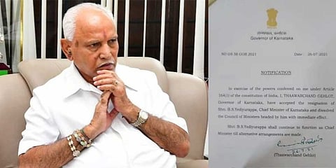 ಇದಕ್ಕೂ ಮೊದಲು ಸಿಎಂ ಬಿಎಸ್ ಯಡಿಯೂರಪ್ಪ ಅವರು, ರಾಜ್ಯಪಾಲ ಥಾವರ್ ಚಂದ್ ಗೆಹ್ಲೋಟ್ ಅವರನ್ನು ಭೇಟಿ ಮಾಡಿ ತಮ್ಮ ರಾಜಿನಾಮೆ ಪತ್ರ ಸಲ್ಲಿಕೆ ಮಾಡಿದರು. ಈ ವೇಳೆ ರಾಜ್ಯಪಾಲರು ಮುಂದಿನ ಸಿಎಂ ಪದಗ್ರಹಣ ಮಾಡುವವರೆಗೂ ಹಂಗಾಮಿ ಸಿಎಂ ಆಗಿ ಮುಂದುವರೆಯುವಂತೆ ಸೂಚನೆ ನೀಡಿದರು. ಅಲ್ಲದೆ ಹಾಲಿ ಹಾಲಿ ಸಚಿವ ಸಂಪುಟವನ್ನು ವಿಸರ್ಜನೆ ಮಾಡಿದರು.