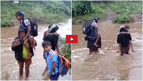 ಮಕ್ಕಳ ಸಮಸ್ಯೆಯನ್ನು ಅರಿತ ಪೋಷಕರು ಮಕ್ಕಳನ್ನು ಭುಜದ ಮೇಲೆ ಕೂರಿಸಿಕೊಂಡು ಹಾಗೂ ಎತ್ತಿಕೊಂಡು ರಸ್ತೆ ದಾಟಿಸಿದರು.