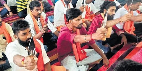 ಕರಾವಳಿಯಲ್ಲಿ ಮತಾಂತರ ವಿರುದ್ಧ ಜಾಗೃತಿ ಹಾಗೂ ಹೋರಾಟ ಕೈಗೆತ್ತಿಕೊಂಡಿರುವ ಹಿಂದೂ ಸಂಘಟನೆಗಳು ಇದೀಗ ಕಾರ್ಯಕರ್ತರ ಕೈಗೆ ಬಹಿರಂಗವಾಗಿಯೇ ಶಸ್ತ್ರಗಳನ್ನು ಕೊಟ್ಟಿರುವುದು ಚರ್ಚೆಗೆ ಗ್ರಾಸವಾಗಿದೆ.
