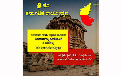 ಬೆಂಗಳೂರು: ಕನ್ನಡ ರಾಜ್ಯೋತ್ಸವನ್ನು ಮೈಕ್ರೋ ಬ್ಲಾಗಿಂಗ್ ವೇದಿಕೆಯಾಗಿರುವ ಕೂ ನಲ್ಲಿ ವಿಶಿಷ್ಟವಾಗಿ ಆಚರಿಸಲು ವಿಶೇಷ ಅವಕಾಶವನ್ನು ಒದಗಿಸಲಾಗಿದೆ. ಕನ್ನಡ ಭಾಷೆಯನ್ನು ಸಂಭ್ರಮಿಸುವವರಿಗೆ ಬಹು - ಭಾಷೆಯ ಮೈಕ್ರೋ ಬ್ಲಾಗಿಂಗ್ ವೇದಿಕೆಯಾದ 'ಕೂ' ಕರ್ನಾಟಕ ರಾಜ್ಯೋತ್ಸವದ ಸಂದರ್ಭದಲ್ಲಿ ವಿಶೇಷ ಸ್ಪರ್ಧೆಯನ್ನು ಆಯೋಜಿಸಿದೆ.