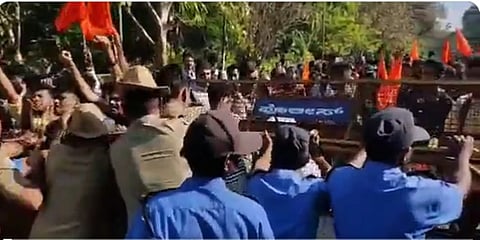 ಮಂಗಳೂರು ವಿವಿ ಆಡಳಿತ ಸೌಧದ ಆವರಣಕ್ಕೆ ಬಂದಾಗ ಪೊಲೀಸರು ತಡೆದಿದ್ದು, ಈ ವೇಳೆ ಎಬಿವಿಪಿ ಕಾರ್ಯಕರ್ತರು ಬ್ಯಾರಿಕೇಡ್ ಗಳನ್ನು ತಳ್ಳಿ ನುಗ್ಗಲು ಯತ್ನಿಸಿದ್ದಾರೆ. ಬಳಿಕ ವಿ.ವಿ ಪರೀಕ್ಷಾಂಗ ಕುಲಸಚಿವ ಪ್ರೊ.ಪಿ.ಎಲ್ ಧರ್ಮ ಮತ್ತು ಕುಲಪತಿ ಪಿ.ಎಸ್ ಯಡಪಡಿತ್ತಾಯ ಆಗಮಿಸಿದ್ದು, ಈ ವೇಳೆ ಪರಿಸ್ಥಿತಿ ನಿಯಂತ್ರಣಕ್ಕೆ ಬಂದಿದೆ. ವಿ.ವಿ ಪದವಿ ಮತ್ತು ಸ್ನಾತಕೋತ್ತರ ವಿದ್ಯಾರ್ಥಿಗಳಿಗೆ ಅಂಕಪಟ್ಟಿ ನೀಡದೆ ಸತಾಯಿಸುತ್ತಿದ್ದು, ಅಂಕಪಟ್ಟಿ ಬಾರದೇ ವಿದ್ಯಾರ್ಥಿ ವೇತನಕ್ಕೆ ಅರ್ಜಿ ಹಾಕಲಾಗದೇ ಸಮಸ್ಯೆ ಎದುರಾಗಿದೆ.