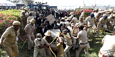 ಬೆಳಗಾವಿ: ವಕೀಲರ ಸಂರಕ್ಷಣಾ ಕಾಯ್ದೆ ರೂಪಿಸಿ, ಜಾರಿಗೊಳಿಸಲು ಆಗ್ರಹಪಡಿಸಿ ಅಪಾರ ಸಂಖ್ಯೆಯ ವಕೀಲರು ಮಂಗಳವಾರ ಸುವರ್ಣ ಸೌಧದ ಎದುರು ಬೃಹತ್ ಪ್ರತಿಭಟನೆ ನಡೆಸಿದರು. ಪ್ರತಿಭಟನಾ ನಿರತ ವಕೀಲರು ಕೆಲ ಗಂಟೆಗಳ ಕಾಲ ಪುಣೆ- ಬೆಂಗಳೂರು ರಾಷ್ಟ್ರೀಯ ಹೆದ್ದಾರಿಯನ್ನು ಬಂದ್ ಮಾಡಿದರು. ಅಲ್ಲದೇ ಸುವರ್ಣ ಸೌಧಕ್ಕೆ ಮುತ್ತಿಗೆ ಹಾಕಲು ಪ್ರಯತ್ನಿಸಿದಾಗ ಪೊಲೀಸರು ಅವರನ್ನು ತಡೆದರು.