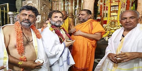 ಆಂಧ್ರ ಪ್ರದೇಶ: ಕಾಂಗ್ರೆಸ್ ನಾಯಕ ರಾಹುಲ್ ಗಾಂಧಿ ಗುರುವಾರ ರಾತ್ರಿ ಮಂತ್ರಾಲಯದಲ್ಲಿರುವ ಪ್ರಸಿದ್ಧ ಗುರು ರಾಘವೇಂದ್ರ ಸ್ವಾಮಿಯ ದೇಗುಲಕ್ಕೆ ಭೇಟಿ ನೀಡಿ ವಿಶೇಷ ಪೂಜೆ ಸಲ್ಲಿಸಿದರು.