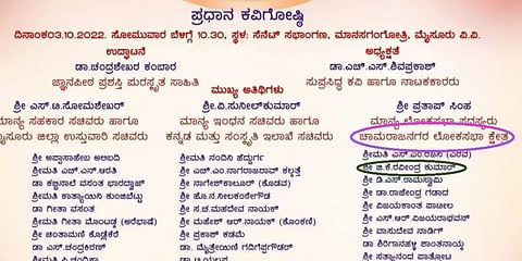 ಮೈಸೂರು: ನಾಡಹಬ್ಬ ದಸರಾದ ಪ್ರಧಾನ ಕವಿಗೋಷ್ಠಿಯ ಆಹ್ವಾನ ಪತ್ರಿಕೆಯಲ್ಲಿ ನಿಧನರಾದವರ ಹೆಸರನ್ನು ಪ್ರಕಟಿಸಿ ಕನ್ನಡ ಮತ್ತು ಸಂಸ್ಕೃತಿ ಇಲಾಖೆ ಎಡವಟ್ಟು ಮಾಡಿಕೊಂಡಿದೆ. ಪ್ರಧಾನ ಕವಿಗೋಷ್ಟಿಯಲ್ಲಿ ರಾಜಕೀಯ ಮುಖಂಡರು ಭಾಗವಹಿಸಲಿದ್ದು, ನಿಧನರಾದ ಆಕಾಶವಾಣಿ ನಿಲಯ ನಿರ್ದೇಶಕ ಜಿ.ಕೆ ರವೀಂದ್ರ ಕುಮಾರ್ ಅವರ ಹೆಸರು ಆಹ್ವಾನ ಪತ್ರಿಕೆಯಲ್ಲಿದೆ.