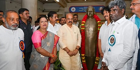 ಬೆಂಗಳೂರು: ದೇವರಾಜ್ ಅರಸು ಅವರ 107ನೇ ಜನ್ಮ ದಿನಾಚರಣೆ ಅಂಗವಾಗಿ ವಿಧಾನಸೌಧದ ಪಶ್ವಿಮದ್ವಾರದ ಬಳಿ ಇರುವ ದೇವರಾಜ್ ಅರಸು ಪುತ್ಥಳಿಗೆ ಮುಖ್ಯಮಂತ್ರಿ ಬಸವರಾಜ ಬೊಮ್ಮಾಯಿ ಅವರು ಶನಿವಾರ ಮಾಲಾರ್ಪಣೆ ಮಾಡಿದರು.
