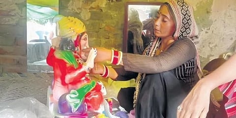 ಗಣೇಶನ ಮೂರ್ತಿಗೆ ಅಂತಿಮ ಸ್ಪರ್ಶ ನೀಡುತ್ತಿರುವ ಕಲಾವಿದೆ
