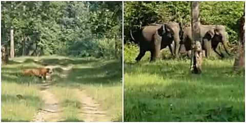 ಆನೆಗಳ ಹಿಂಡಿನಲ್ಲಿ ತೆರಳುತ್ತಿದ್ದ ಮರಿಯೊಂದನ್ನು ಹುಲಿ ಅಟ್ಟಿಸಿಕೊಂಡು ಹೋಗಿರುವ ವಿಡಿಯೋವನ್ನು ಪ್ರವಾಸಿಗರು ತಮ್ಮ ಮೊಬೈಲ್ ನಲ್ಲಿ ಚಿತ್ರೀಕರಿಸಿದ್ದು, ತದನಂತರ ಸಾಮಾಜಿಕ ಜಾಲತಾಣಗಳಲ್ಲಿ ಹರಿಯಬಿಟಿದ್ದಾರೆ. ಈ ವಿಡಿಯೋ ಇದೀಗ ಸೋಶಿಯಲ್ ಮೀಡಿಯಾಗಳಲ್ಲಿ ಸಖತ್ ವೈರಲ್ ಆಗಿದೆ.