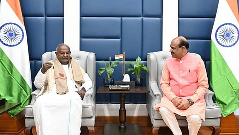 ಭೇಟಿ ವೇಳೆ ದೇವೇಗೌಡ ಅವರು ಲೋಕಸಭಾ ಸ್ಪೀಕರ್ ಓಂ ಬಿರ್ಲಾ ಅವರಿಗೆ ತಮ್ಮ ಜೀವನಾಗಾಥೆಯ ಪುಸ್ತಕವನ್ನು ನೀಡಿದರು.
