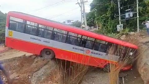 ಬಸ್ ತಲಕಾಡು ಕಡೆಯಿಂದ ಮಳವಳ್ಳಿ ಕಡೆಗೆ ಬರುತ್ತಿದ್ದ ವೇಳೆ ಈ ಅವಘಡ ಸಂಭವಿಸಿದೆ. ವೇಗವಾಗಿ ಬಂದ ಬಸ್ ಸೇತುವೆ ನಿರ್ಮಾಣಕ್ಕೆ ತೆಗೆದಿದ್ದ ಹಳ್ಳಕ್ಕೆ ನುಗ್ಗಿದೆ. ಬಸ್ ಹಳ್ಳಕ್ಕೆ ಬೀಳುತ್ತಿದ್ದಂತೆ ಪಿಲ್ಲರ್ಗಳಿಗೆ ಹಾಕಿದ್ದ ಕಬ್ಬಿಣದ ಸಲಾಕೆಗಳು ಬಾಗಿವೆ. ಅದೃಷ್ಟವಶಾತ್ ಬಸ್ ನೇರವಾಗಿ ಹಳ್ಳಕ್ಕೆ ಇಳಿದಿದೆ.