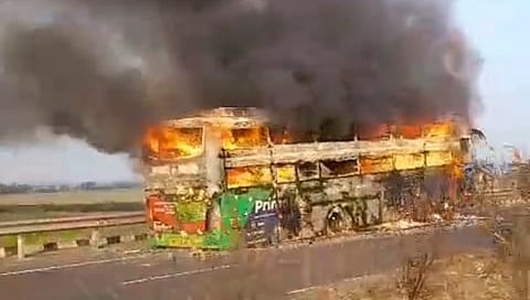 ಬೆಂಗಳೂರಿನಿಂದ ವಿಜಯಪುರಕ್ಕೆ ಆಗಮಿಸುತ್ತಿದ್ದ ಖಾಸಗಿ ಬಸ್ ಒಂದು ರಸ್ತೆಮಧ್ಯೆ ಹೊತ್ತಿ ಉರಿದ ಘಟನೆ ನಡೆದಿದ್ದು ಅದೃಷ್ಟವಶಾತ್ ಎಲ್ಲಾ ಪ್ರಯಾಣಿಕರು ಪಾರಾಗಿದ್ದಾರೆ.