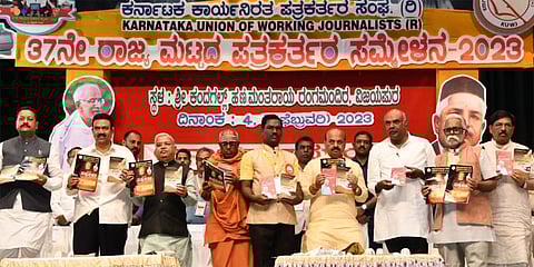 ಕರ್ನಾಟಕ ಕಾರ್ಯನಿರತ ಪತ್ರಕರ್ತರ ಸಂಘವು ವಿಜಯಪುರ ನಗರದ ಕಂದಗಲ್ ಹನುಮಂತ ರಾಯ ರಂಗಮಂದಿರದಲ್ಲಿ ಆಯೋಜಿರುವ ಎರಡು ದಿನಗಳ ಪತ್ರಕರ್ತರ 37ನೇ ರಾಜ್ಯ ಸಮ್ಮೇಳನದಲ್ಲಿ ಸ್ಮರಣ ಸಂಚಿಕೆ ಬಿಡುಗಡೆ ಮಾಡಿ ಮಾತನಾಡಿದ ಅವರು, 'ಸ್ವಾತಂತ್ರ್ಯ ಹೋರಾಟಗಾರರಾಗಿದ್ದ ಮಹಾತ್ಮ ಗಾಂಧೀಜಿ, ಸಂವಿಧಾನ ಶಿಲ್ಪಿ ಅಂಬೇಡ್ಕರ್ ಕೂಡ ಪತ್ರಕರ್ತರು ಆಗಿದ್ದರು. ಹೀಗಾಗಿ ಪತ್ರಕರ್ತರು ಹೆಮ್ಮೆ ಪಡಬೇಕು ಎಂದರು.