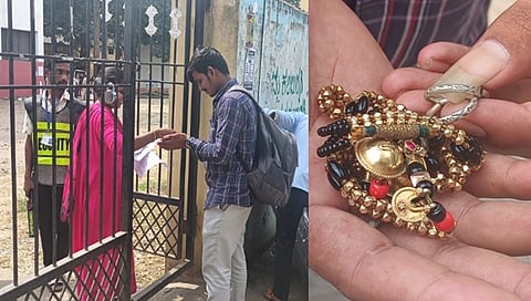 ಆದರೆ, ಮಹಿಳೆಯ ಮುತ್ತೈದೆತನದ ಸಂಕೇತವಾಗಿರುವ ಮಂಗಳಸೂತ್ರ ಹಾಗೂ ಕಾಲುಂಗುರಗಳನ್ನು ಧರಿಸಲು ಅವಕಾಶ ನೀಡಿತ್ತು. ಆದರೆ, ನಗರದ ಪೊಲೀಸ್ ಕಮಿಷನರ್ ಕಚೇರಿ ಪಕ್ಕದಲ್ಲೇ ಇರುವ ಸರ್ಕಾರಿ ಬಾಲಕಿಯರ ಪದವಿ ಪೂರ್ವ ಕಾಲೇಜು ಪರೀಕ್ಷಾ ಕೇಂದ್ರದಲ್ಲಿದ್ದ ಭದ್ರತಾ ಸಿಬ್ಬಂದಿ, ವಿವಾಹಿತ ಮಹಿಳೆಯರು ಮಂಗಳಸೂತ್ರ ಹಾಗೂ ಕಾಲುಂಗುರ ಧರಿಸಿಕೊಂಡು ಪರೀಕ್ಷಾ ಕೇಂದ್ರ ಪ್ರವೇಶಿಸಲು ಅವಕಾಶ ನೀಡಿಲ್ಲ. ಹೀಗಾಗಿ ಅಭ್ಯರ್ಥಿಗಳು ಅನಿವಾರ್ಯವಾಗಿ ತಾಳಿ ಹಾಗೂ ಕಾಲುಂಗುರ ತೆಗೆದಿಟ್ಟೇ ಪರೀಕ್ಷೆ ಬರೆದಿದ್ದಾರೆ. ಸಿಬ್ಬಂದಿಗಳ ಈ ವರ್ತನೆಗೆ ಅಭ್ಯರ್ಥಿಗಳು ಆಕ್ರೋಶ ಹೊರಹಾಗಿದ್ದಾರೆ.
