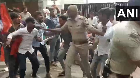 ಸದಾಶಿವನಗರದ ಗೃಹ ಸಚಿವರ ಸರ್ಕಾರಿ ನಿವಾಸದ ಮುಂದೆ ಎಬಿವಿಪಿ ಕಾರ್ಯಕರ್ತರು ಇಂದು ಪ್ರತಿಭಟನೆ ನಡೆಸಿದರು. ಈ ವೇಳೆ ಮುತ್ತಿಗೆಗೆ ಯತ್ನಿಸಿದರು. ಅನುಮತಿ ಪಡೆಯದೆ ಪ್ರತಿಭಟನೆ ನಡೆಸಿದ ಹಿನ್ನೆಲೆಯಲ್ಲಿ ಪೊಲೀಸರು ಹಲವರನ್ನು ವಶಕ್ಕೆ ಪಡೆದರು.