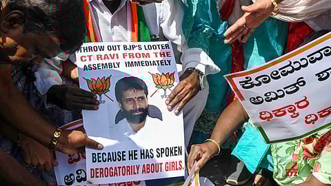 ಪ್ರತಿಭಟನೆ ವೇಳೆ ಸಿ.ಟಿ.ರವಿ ಅವರನ್ನು ‘ಒಟಿ ರವಿ, ಒಸಿ ರವಿ’ ಎಂದು ಕರೆದ ಅವರು, ಸಚಿವೆ ಲಕ್ಷ್ಮೀ ಹೆಬ್ಬಾಳ್ಕರ್ ವಿರುದ್ಧ ಅವಹೇಳನಕಾರಿ ಪದಗಳನ್ನು ಬಳಸಿದ್ದಕ್ಕಾಗಿ ಬಹಿರಂಗ ಕ್ಷಮೆಯಾಚಿಸಬೇಕು ಎಂದು ಒತ್ತಾಯಿಸಿದರು.