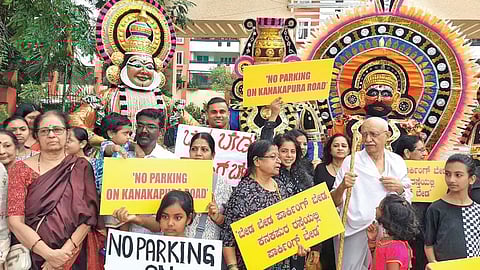ಕನಕಪುರ ರಸ್ತೆಯ ಅಪಾರ್ಟ್ಮೆಂಟ್ಗಳ ನಿವಾಸಿಗಳು ಯಕ್ಷಗಾನ ವೇಷಭೂಷಣಗಳನ್ನು ಧರಿಸಿ ಪ್ರತಿಭಟನೆ ನಡೆಸಿದರು.