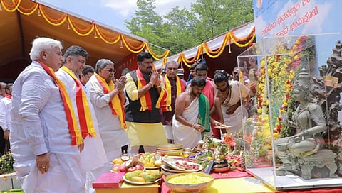 ಬೆಂಗಳೂರು: ವಿಧಾನಸೌಧ ಆವರಣದಲ್ಲಿ ನಾಡದೇವಿ ಭುವನೇಶ್ವರಿ ಕಂಚಿನ ಪ್ರತಿಮೆ ಸ್ಥಾಪನೆಗೆ ಮುಖ್ಯಮಂತ್ರಿ ಸಿದ್ದರಾಮಯ್ಯ ಗುರುವಾರ ಭೂಮಿ ಪೂಜೆ ನೆರವೇರಿಸಿದರು. ಉಪ ಮುಖ್ಯಮಂತ್ರಿ ಡಿಕೆ ಶಿವಕುಮಾರ್, ಕಾನೂನು ಸಚಿವ ಎಚ್. ಕೆ. ಪಾಟೀಲ್ ಮತ್ತಿತರರು ಕಾರ್ಯಕ್ರಮದಲ್ಲಿ ಪಾಲ್ಗೊಂಡರು.