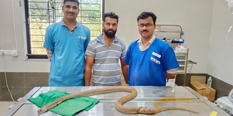 ಬೆಳಗಾವಿಯ ಮಲ್ಟಿ ಸ್ಪೆಷಾಲಿಟಿ ವೆಟರ್ನರಿ ಆಸ್ಪತ್ರೆಯ ತಜ್ಞ ಪಶುವೈದ್ಯರು, ನಾಗರ ಹಾವನ್ನು ರಕ್ಷಿಸಲು ಕ್ಲಿಷ್ಟಕರವಾದ ಶಸ್ತ್ರಚಿಕಿತ್ಸೆ ನಡೆಸಿದ್ದಾರೆ. ಹಾವಿನ ದೇಹವನ್ನು ಪುನಃ ಜೋಡಿಸಲು ವೈದ್ಯರು 40 ಕ್ಕೂ ಹೆಚ್ಚು ಹೊಲಿಗೆಗಳನ್ನು ಹಾಕಿದ್ದಾರೆ.