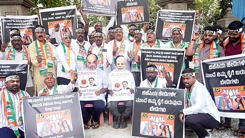 ಬೆಂಗಳೂರು: ನ್ಯಾಷನಲ್ ಹೆರಾಲ್ಡ್ ಪ್ರಕರಣದಲ್ಲಿ ರಾಜ್ಯಸಭಾ ಸದಸ್ಯೆ ಸೋನಿಯಾ ಗಾಂಧಿ ಮತ್ತು ಲೋಕಸಭೆಯ ವಿರೋಧ ಪಕ್ಷದ ನಾಯಕಿ ರಾಹುಲ್ ಗಾಂಧಿ ವಿರುದ್ಧ ಜಾರಿ ನಿರ್ದೇಶನಾಲಯ ಆರೋಪಪಟ್ಟಿ ಸಲ್ಲಿಸಿರುವುದಕ್ಕೆ ತೀವ್ರ ಆಕ್ರೋಶ ವ್ಯಕ್ತಪಡಿಸುತ್ತಿರುವ ರಾಜ್ಯದ ಆಡಳಿತ ಪಕ್ಷದ ಸದಸ್ಯರು. ಜಾರಿ ನಿರ್ದೇಶನಾಲಯದ ಕಚೇರಿಯ ಹೊರಗೆ ಬುಧವಾರ ಪ್ರತಿಭಟನೆ ನಡೆಸಿದರು.