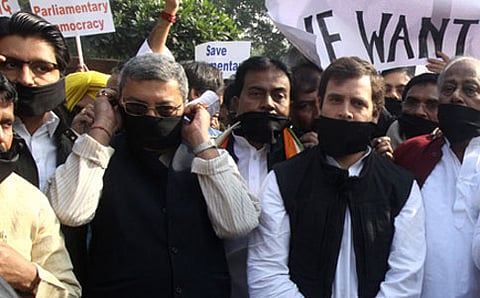ಕಾಂಗ್ರೆಸ್ ಉಪಾಧ್ಯಕ್ಷ ರಾಹುಲ್ಗಾಂಧಿ ಸೇರಿದಂತೆ ಪ್ರತಿಪಕ್ಷಗಳ ಸದಸ್ಯರೆಲ್ಲರೂ ಬೆಳಗ್ಗೆ ಗಾಂಧಿ ಪ್ರತಿಮೆಯ ಮುಂದೆ ನಿಂತು, ಬಾಯಿಗೆ ಕಪ್ಪುಬಟ್ಟೆ ಕಟ್ಟಿಕೊಂಡು ಪ್ರತಿಭಟನೆ ನಡೆಸಿದರು. ಅವಹೇಳನಕಾರಿ ಹೇಳಿಕೆ ನೀಡಿದ ಸಾಧ್ವಿಯನ್ನು ಕಿತ್ತುಹಾಕಬೇಕು ಎಂದು ಒತ್ತಾಯಿಸಿದರು. ಈ ವೇಳೆ ಮಾತನಾಡಿದ ರಾಹುಲ್, ನಮಗೆ ಸಂಸತ್ನೊಳಗೆ ಮಾತನಾಡಲು ಅವಕಾಶ ನೀಡುತ್ತಿಲ್ಲ.