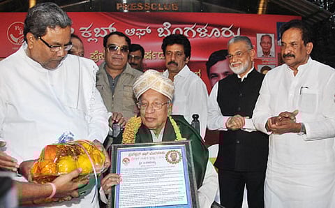 ಬೆಂಗಳೂರು: ಇಸ್ರೋ ಅಧ್ಯಕ್ಷರಾಗಿದ್ದ ಡಾ.ಕೆ.ರಾಧಾಕೃಷ್ಣನ್ ಅವರಿಗೆ ಬುಧವಾರ ಬೆಂಗಳೂರು ಪ್ರೆಸ್ ಕ್ಲಬ್ ವತಿಯಿಂದ 'ಪ್ರೆಸ್ ಕ್ಲಬ್ ವರ್ಷದ ವ್ಯಕ್ತಿ' ಪ್ರಶಸ್ತಿ ನೀಡಿ ಗೌರವಿಸಲಾಯಿತು. ಮುಖ್ಯಮಂತ್ರಿ ಸಿದ್ದರಾಮಯ್ಯ ಪ್ರಶಸ್ತಿ ಪ್ರದಾನ ಮಾಡಿದರು.