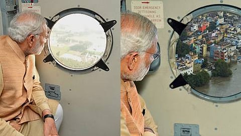 ಜಲಾವೃತಗೊಂಡಿರುವ ಪ್ರದೇಶಗಳನ್ನು ಪ್ರಧಾನಿ ವಿಮಾನದ ಕಿಟಕಿ ಮೂಲಕ ವೀಕ್ಷಿಸುತ್ತಿರುವ ಚಿತ್ರ ಇದಾಗಿದ್ದು, ಮೂಲ ಫೋಟೋದಲ್ಲಿ ಕಿಟಕಿ ಮಸುಕಾಗಿ ಕಾಣುತ್ತಿದೆ. ಬಳಿಕ ಇದನ್ನು ಫೋಟೋಶಾಪ್ನಲ್ಲಿ ತಿದ್ದಿ ಹೊರಗಿನ ದೃಶ್ಯ ಕಾಣುವಂತೆ ಮಾಡಲಾಗಿದೆ. ಇದರಿಂದ ನೈಜತೆಗೆ ಧಕ್ಕೆ ಯಾಗಿದೆ ಎಂಬ ಆರೋಪ ಕೇಳಿಬರುತ್ತಿದೆ.