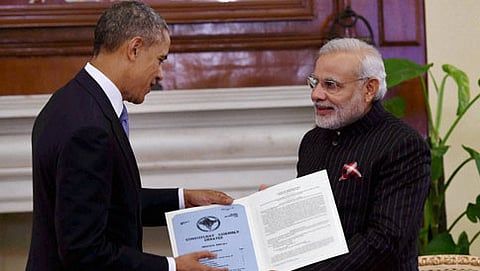 ಭಾರತಕ್ಕೆ ಭೇಟಿ ನೀಡಿರುವ ಅಮೆರಿಕ ಅಧ್ಯಕ್ಷ ಒಬಾಮಗೆ ಸದ್ಭಾವನೆಯ ಸಂಕೇತವಾಗಿ ಪ್ರಧಾನಿ ನರೇಂದ್ರ ಮೋದಿ ಅವರು ಭಾರತ-ಅಮೆರಿಕ ಇತಿಹಾಸದ ತುಣುಕನ್ನು ಉಡುಗೊರೆಯಾಗಿ ನೀಡಿದ್ದಾರೆ.