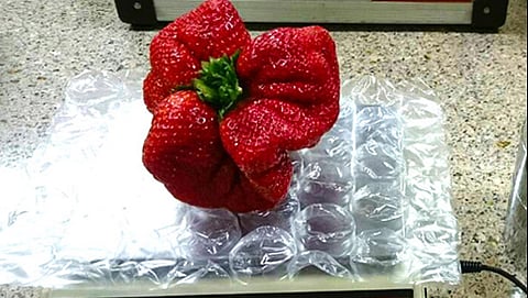 ಟೋಕಿಯೋ: ಜಗತ್ತಿನಲ್ಲೇ ಅತೀ ದೊಡ್ಡ ಸ್ಟ್ರಾಬೆರ್ರಿ ಜಪಾನಿನಲ್ಲಿ ಬೆಳೆದಿದೆ. ಇಲ್ಲಿನ ಫುಕೋಂಕಾದಲ್ಲಿ ಕೋಜೋ ನಕಾವೋ ಎಂಬವರ ತೋಟದಲ್ಲಿ ಬೆಳೆದಿರುವ ಈ ಸ್ಟ್ರಾಬೆರ್ರಿ 250 ಗ್ರಾಂ ತೂಕವಿದೆ. ಅತೀ ದೊಡ್ಡ ಸ್ಟ್ರಾಬೆರ್ರಿ ಎಂದೇ ವಿಶ್ವ ದಾಖಲೆ ಸೃಷ್ಟಿಸಿರುವ ಇದು ಎಂಟು ಸೆ.ಮೀ ಎತ್ತರ, 12 ಸೆಮೀ ಉದ್ದ, 30 ಸೆ.ಮೀ ಸುತ್ತಳತೆ ಹೊಂದಿದೆ.