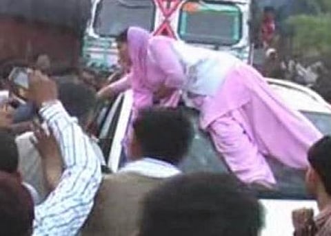 ಸಮಾಜವಾದಿ ಪಕ್ಷದ ಮುಖಂಡನ ಗನ್ ಮ್ಯಾನ್ ಕಣ್ಣು ಹೊಡೆದಿದ್ದಕ್ಕೆ ಮಹಿಳೆಯೊಬ್ಬಳು ಮರ್ಸಿಡಿಸ್ ಕಾರಿನ ಮೇಲೆ ಹತ್ತಿ, ಕಾರಿನ ವೈಂಡ್ ಶೀಲ್ಡ್ ಮುರಿದು ಹಾಕಿದ ಘಟನೆ ಉತ್ತರ ಪ್ರದೇಶದ ಆಗ್ರಾದಲ್ಲಿ ನಡೆದಿದೆ.