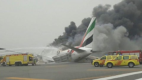 ಎಮಿರೇಟ್ಸ್ ವಿಮಾನ ಸಂಸ್ಥೆಯ ಬೋಯಿಂಗ್ 777 ವಿಮಾನ ದುಬೈ ಅಂತಾರಾಷ್ಟ್ರೀ ವಿಮಾನ ನಿಲ್ದಾಣದಲ್ಲಿ ಲ್ಯಾಂಡಿಂಗ್ ಆಗುವ ವೇಳೆ ಲ್ಯಾಂಡಿಂಗ್ ಗೇರ್ ದೋಷದಿಂದಾಗಿ ವಿಮಾನದ ಬಲಭಾಗ ರನ್ವೇಗೆ ಉಜ್ಜಿದೆ. ಹೀಗಾಗಿ ವಿಮಾನದಲ್ಲಿ ಬೆಂಕಿ ಕಾಣಿಸಿಕೊಂಡಿದ್ದು, ವಿಮಾನದೊಳಗೆ ದಟ್ಟ ಹೊಗೆ ಆವರಿಸಿದೆ. ವಿಮಾನದಲ್ಲಿದ್ದ ಎಲ್ಲ ಪ್ರಯಾಣಿಕರು ಕೆಲಕಾಲ ಆತಂಕಗೊಂಡರಾದರೂ, ವಿಮಾನದ ಸಿಬ್ಬಂದಿಗಳು ಕೂಡಲೇ ತುರ್ತು ನಿರ್ಗಮನದ ಬಾಗಿಲುಗಳನ್ನು ತೆರೆದ ಹಿನ್ನಲೆಯಲ್ಲಿ ಎಲ್ಲ ಪ್ರಯಾಣಿಕರು ಸುರಕ್ಷಿತವಾಗಿ ಇಳಿದಿದ್ದಾರೆ.
