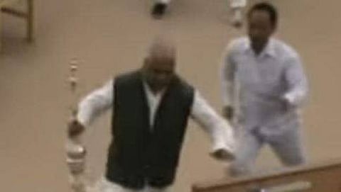 ಅಗರ್ತಲಾ: ತ್ರಿಪುರಾದಲ್ಲಿ ವಿಧಾನಸಭಾ ಕಲಾಪ ನಡೆಯುತ್ತಿದ್ದ ವೇಳೆ ಟಿಎಂಸಿ ಶಾಸಕರೊಬ್ಬರು ಸ್ಪೀಕರ್ ಅವರ ಸಾಂಕೇತಿಕ ಬೆಳ್ಳಿಯ ದಂಡವನ್ನು ಕಸಿದುಕೊಂಡು ಸದನದ ತುಂಬಾ ಓಡುತ್ತಾ, ಕಲಾಪವನ್ನು ತಡೆದ ವಿಲಕ್ಷಣಕಾರಿ ಘಟನೆಯೊಂದು ಮಂಗಳವಾರ ನಡೆದಿದೆ.