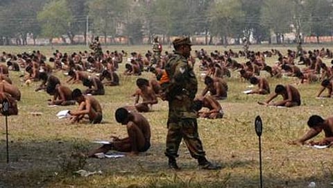 ಮುಜಾಫರ್ ನಗರ(ಬಿಹಾರ): ಬಿಹಾರದ ಮುಜಾಫರ್ ನಗರ ಜಿಲ್ಲೆಯಲ್ಲಿ ಸೇನಾ ನೇಮಕಾತಿ ಪರೀಕ್ಷೆಯಲ್ಲಿ ಅಭ್ಯರ್ಥಿಗಳನ್ನು ಬಟ್ಟೆಯೆಲ್ಲಾ ಕಳಚಿ ಬರೀ ಚಡ್ಡಿಯಲ್ಲಿ ಮೈದಾನದಲ್ಲಿ ಕುಳ್ಳಿರಿಸಿ ಪರೀಕ್ಷೆ ಬರೆಸಿದ ವಿಲಕ್ಷಣ ಮತ್ತು ಆಘಾತಕಾರಿ ಘಟನೆ ನಡೆದಿದೆ.