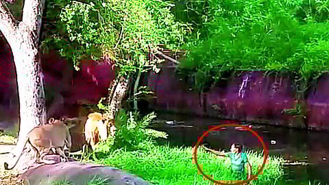 ಹೈದರಾಬಾದ್ ನ ನೆಹರೂ ಮೃಗಾಲಯದಲ್ಲಿ ಭಾನುವಾರ ಈ ಘಟನೆ ನಡೆದಿದ್ದು, ರಾಜಸ್ತಾನ ಮೂಲದ ಸುಮಾರು 35 ವರ್ಷ ವಯಸ್ಸಿನ ಮುಖೇಶ್ ಎಂಬಾತನೇ ಸಿಂಹಗಳ ಪಾರ್ಕ್ ಜಿಗಿದ ವ್ಯಕ್ತಿಯಾಗಿದ್ದಾನೆ. ಎಚ್ಚರಿಕೆ ಫಲಕವಿದ್ದರೂ ಅದನ್ನು ನಿರ್ಲಕ್ಷಿಸಿದ ಠಾಕೂರ್ ಪಾರ್ಕ್ ನ ಗೋಡೆ ಹತ್ತಿ ಒಳಗೆ ಜಿಗಿದಿದ್ದಾನೆ. ಅದೃಷ್ಟವಶಾತ್ ಅಲ್ಲಿಯೇ ಕೆಲಸ ಮಾಡುತ್ತಿದ್ದ ಮೃಗಾಲಯದ ಸಿಬ್ಬಂದಿ ಆರ್ ಪಾಪಯ್ಯ ಎಂಬುವವರು ಇದನ್ನು ಕಂಡ ತನ್ನ ಇತರೆ ಸಹೋದ್ಯೋಗಿಗಳನ್ನು ಎಚ್ಚರಿಸಿದ್ದಾರೆ.