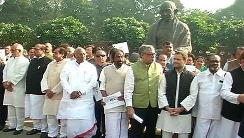 ನವದೆಹಲಿ: ದುಬಾರಿ ನೋಟಿನ ಮೇಲೆ ನಿಷೇಧ ಹೇರಿ ಕಠಿಣ ನಿರ್ಧಾರ ತೆಗೆದುಕೊಂಡಿದ್ದ ಕೇಂದ್ರ ವಿರುದ್ಧ ವಿರೋಧ ಪಕ್ಷಗಳು ತಮ್ಮ ಪ್ರತಿಭಟನೆಯನ್ನು ತೀವ್ರಗೊಳಿಸಲು ಮುಂದಾಗಿದ್ದು, ಕೇಂದ್ರ ಸರ್ಕಾರದ ವಿರುದ್ಧ ಐಕ್ಯತೆ ಪ್ರದರ್ಶಿಸಿ ಸಂಸತ್ತಿನ ಮುಂದೆ ಮಾನವ ಸರಪಳಿ ನಿರ್ಮಿಸಿ ಬುಧವಾರ ಪ್ರತಿಭಟನೆ ನಡೆಸುತ್ತಿದೆ.