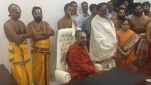 ಹೈದರಾಬಾದ್: ತೆಲಂಗಾಣ ಮುಖ್ಯಮಂತ್ರಿ ಕೆ. ಚಂದ್ರಶೇಖರ್ ರಾವ್ ಅವರ ಸಿಎಂ ಕುರ್ಚಿಯಲ್ಲಿ ಸ್ವಾಮೀಜಿ ತ್ರಿದಂಡಿ ಶ್ರೀರಾಮಾನಾರಾಯಣ ರಾಮಾನುಜ ಚಿನ್ನ ಜಿಯಾರ್ ಸ್ವಾಮಿ ಕುಳಿತ ವಿಷಯ ಎಲ್ಲೆಡೆ ಚರ್ಚೆಗೆ ಕಾರಣವಾಗಿದೆ.