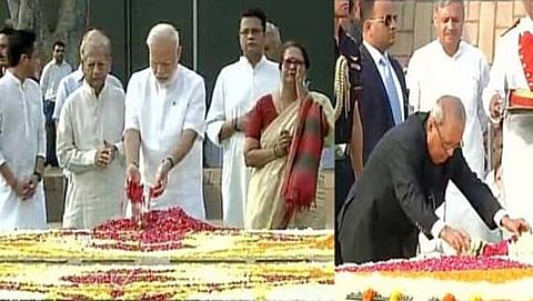 ಪ್ರಧಾನಮಂತ್ರಿ ನರೇಂದ್ರ ಮೋದಿಯವರೊಂದಿಗೆ ಕೇಂದ್ರ ಸಚಿವ ವೆಂಕಯ್ಯ ನಾಯ್ಡು ಮತ್ತು ಮಾಜಿ ಪ್ರಧಾನಮಂತ್ರಿ ಮನಮೋಹನ್ ಸಿಂಗ್, ದೆಹಲಿ ಮುಖ್ಯಮಂತ್ರಿ ಅರವಿಂದ ಕೇಜ್ರಿವಾಲ್, ಎಲ್.ಕೆ. ಅಡ್ವಾಣಿ, ಉಪ ರಾಷ್ಟ್ರಪತಿ ಹಮೀದ್ ಅನ್ಸಾರಿ ಅವರು ಗಾಂಧೀಜಿಯವರ ಸ್ಮಾರಕಕ್ಕೆ ಪುಷ್ಪನಮನವನ್ನು ಸಲ್ಲಿಸಿದರು.