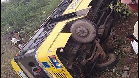 ಗುಂಟೂರು: ಆಂಧ್ರ ಪ್ರದೇಶದ ಗುಂಟೂರು ಜಿಲ್ಲೆಯ ಮಚರ್ಲ ಎಂಬಲ್ಲಿ ಶಾಲಾ ಬಸ್ ಮಗುಚಿ ಬಿದ್ದು ಹಲವು ಮಕ್ಕಳು ಗಾಯಗೊಂಡಿದ್ದಾರೆ.