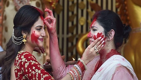 ವಿಜಯ ದಶಮಿ ಆಚರಣೆಯ ಅಂಗವಾಗಿ ಶುಕ್ರವಾರ ಸಂಜೆ ಇಲ್ಲಿ ನಡೆದ ಕಾರ್ಯಕ್ರಮದಲ್ಲಿ ಮಹಿಳಾ ಸಮೂಹದಲ್ಲಿ ಪ್ರಸಿದ್ದವಾಗಿರುವ ಸಿಂದೂರ್ ಖೇಲಾ' ಆಚರ್ಣೆಯಲ್ಲಿ ನುಸ್ರತ್ ಭಾಗವಹಿಸಿದ್ದರು.