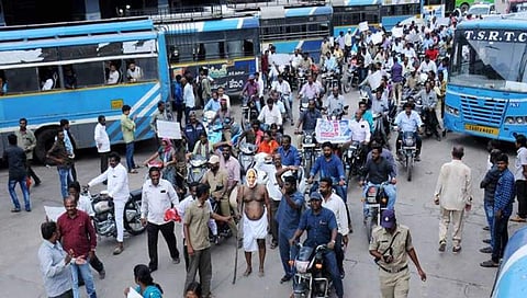 ಪರಕಲ (ತೆಲಂಗಾಣ): ತೆಲಂಗಾಣದಲ್ಲಿ ಬಂದ್ ಆಚರಿಸಲಾಗುತ್ತಿದ್ದು, ಪ್ರತಿಭಟನೆ ವೇಳೆ ತೆಲಂಗಾಣ ರಾಜ್ಯ ರಸ್ತೆ ಸಾರಿಗೆ ನಿಗಮ (ಟಿಎಸ್ಆರ್'ಟಿಸಿ) ನೌಕರರು ಹಾಗೂ ಪೊಲೀಸರು ನಡುವೆ ಘರ್ಷಣೆ ಏರ್ಪಟ್ಟಿದೆ ಎಂದು ಶನಿವಾರ ತಿಳಿದುಬಂದಿದೆ.