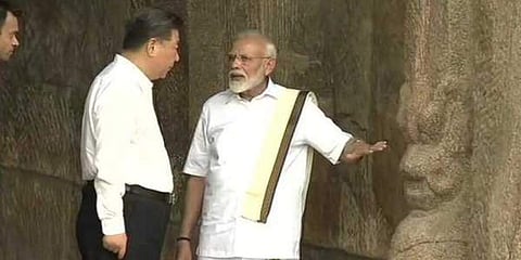 ಇಂದು ಮಧ್ಯಾಹ್ನ ಚೆನ್ನೈ ವಿಮಾನ ನಿಲ್ದಾಣಕ್ಕೆ ಬಂದಿಳಿದ ಚೀನಾ ಅಧ್ಯಕ್ಷರಿಗೆ ಸಾಂಪ್ರದಾಯಿಕ ನೃತ್ಯದ ಮೂಲಕ ತಮಿಳುನಾಡು ಸರ್ಕಾರ ಅಭುತಪೂರ್ವ ಸ್ವಾಗತ ಕೋರಿತ್ತು. ವಿಮಾನ ನಿಲ್ದಾಣದಿಂದ ನೇರವಾಗಿ ಖಾಸಗಿ ಹೋಟೆಲ್ ಗೆ ತೆರಳಿದ ಕ್ಸಿ ಜಿನ್ ಪಿಂಗ್ ಅವರು 4 ಗಂಟೆಗೆ ರಸ್ತೆ ಮೂಲಕ ಮಹಾಬಲಿಪುರಂಗೆ ಆಗಮಿಸಿದರು. ಮಹಾಬಲಿಪುರಂನಲ್ಲಿ ಚೀನಾ ಅಧ್ಯಕ್ಷರ ಆಗಮನಕ್ಕಾಗಿ ಕಾಯುತ್ತಿದ್ದ ಪ್ರಧಾನಿ ಮೋದಿ ಅವರು, ದಕ್ಷಿಣ ಭಾರತದ ಸಾಂಪ್ರದಾಯಿಕ ಧಿರಿಸು ಪಂಚೆ ಧರಿಸಿ ಕ್ಸಿ ಜಿನ್ ಪಿಂಗ್ ಅವರನ್ನು ಬರಮಾಡಿಕೊಂಡರು. ಅಲ್ಲದೆ ಐತಿಹಾಸಿಕ ತಾಣ ಮಹಾಬಲಿಪುರಂ ಕುರಿತು ಚೀನಾ ಅಧ್ಯಕ್ಷರಿಗೆ ಸ್ವತಃ ಗೈಡ್ ಮಾಡಿದರು.