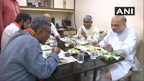 ಕೊಲ್ಕತ್ತಾ: ಪಶ್ಚಿಮ ಬಂಗಾಳದ ಬಾಬಾನಿಪುರದಲ್ಲಿ ಇಂದು ಮನೆ ಮನೆಗೆ ಹೋಗಿ ಮತ ಯಾಚಿಸಿದ ಕೇಂದ್ರ ಗೃಹ ಸಚಿವ ಅಮಿತ್ ಶಾ, ಬಿಜೆಪಿ ಹಿರಿಯ ಮುಖಂಡ ಸಮರೇಂದ್ರ ಪ್ರಸಾದ್ ಬಿಸ್ವಾಸ್ ಅವರ ನಿವಾಸದಲ್ಲಿ ಮಧ್ಯಾಹ್ನದ ಭೋಜನ ಸವಿದರು. ಪಕ್ಷದ ಮುಖಂಡರಾದ ಪಕ್ಷದ ಮುಖಂಡರಾದ ಸ್ವಪನ್ ದಾಸ್ಗುಪ್ತಾ ಮತ್ತು ದಿನೇಶ್ ತ್ರಿವೇದಿ ಕೂಡ ಪಾಲ್ಗೊಂಡಿದ್ದರು.
