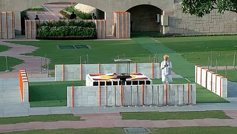 ರಾಜ್ಘಾಟ್ಗೆ ಏಕಾಂಗಿಯಾಗಿ ತೆರಳಿದ ಪ್ರಧಾನಿ ಮೋದಿ, ಮಹಾತ್ಮಾ ಗಾಂಧಿ ಸಮಾಧಿಗೆ ಪುಷ್ಪ ನಮನ ಸಲ್ಲಿಸಿದರು. ಪ್ರಧಾನಿ ಮೋದಿ ಇಲ್ಲಿಂದ ನೇರವಾಗಿ ಕೆಂಪು ಕೋಟೆಗೆ ತೆರಳಿದರು.