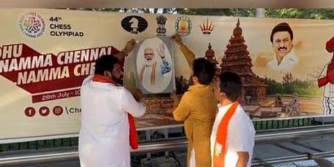 ಜುಲೈ 28ರಿಂದ ನಡೆಯಲಿರುವ ಚೆಸ್ ಒಲಿಂಪಿಯಾಡ್ ಅನ್ನು ತಮಿಳುನಾಡು ಸರ್ಕಾರ ಮತ್ತು ಸಿಎಂ ಸ್ಟಾಲಿನ್ ಹೈಜಾಕ್ ಮಾಡಲು ಹೊರಟ್ಟಿದ್ದು ಈ ಹಿನ್ನೆಲೆಯಲ್ಲಿ ಜಾಹೀರಾತಿನ ಭಿತ್ತಿಪತ್ರದಲ್ಲಿ ಪ್ರಧಾನಿ ಮೋದಿ ಅವರ ಫೋಟೋವನ್ನು ಮುದ್ರಿಸಿಲ್ಲ ಎಂದು ಬಿಜೆಪಿ ಕಾರ್ಯಕರ್ತರು ಆರೋಪಿಸಿದ್ದಾರೆ.