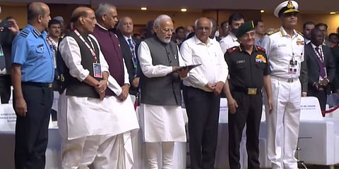 ಗಾಂಧಿನಗರ: ಗುಜರಾತ್ನ ಗಾಂಧಿ ನಗರದಲ್ಲಿಂದು ಆಯೋಜಿಸಲಾಗಿರುವ ದೇಶದ ಮೊದಲ ಡಿಫೆನ್ಸ್ ಎಕ್ಸ್ಪೋ - 2022ರ ಸಮ್ಮೇಳನಕ್ಕೆ ಪ್ರಧಾನಿ ನರೇಂದ್ರ ಮೋದಿ ಇಂದು ಚಾಲನೆ ನೀಡಿದರು.
