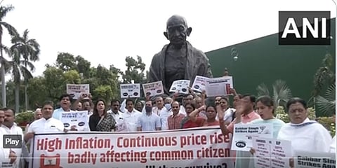 ಅಗತ್ಯ ವಸ್ತುಗಳ ಬೆಲೆ ಏರಿಕೆ, ಹಣದುಬ್ಬರ ವಿರೋಧಿಸಿ ಪ್ರತಿಪಕ್ಷ ಕಾಂಗ್ರೆಸ್ ಹಾಗೂ ಟಿಆರ್ ಎಸ್ ಸಂಸದರು  ಸಂಸತ್ ಆವರಣದಲ್ಲಿರುವ ಮಹಾತ್ಮ ಗಾಂಧಿ ಪ್ರತಿಮೆ ಬಳಿ ಇಂದು ಪ್ರತಿಭಟನೆ ನಡೆಸಿದರು. ಕೇಂದ್ರ ಸರ್ಕಾರದ ವಿರುದ್ಧ ಘೋಷಣೆ ಕೂಗಿ ಆಕ್ರೋಶ ವ್ಯಕ್ತಪಡಿಸಿದರು.