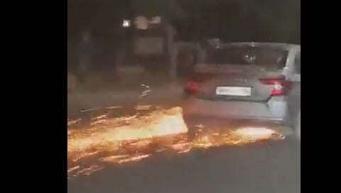 ಕಾರು ಬೈಕ್ ನ್ನು ಎಳೆದುಕೊಂಡು ಹೋಗುತ್ತಿದ್ದಾಗ ಸವೆತದಿಂದಾಗಿ ಬೆಂಕಿಯ ಕಿಡಿಗಳು ಹೊರಹೊಮ್ಮುತ್ತಿರುವುದನ್ನು ಹಿಂದಿನ ವಾಹನಗಳಲ್ಲಿ ಚಲಿಸುತ್ತಿದ್ದ ಕೆಲ ವ್ಯಕ್ತಿಗಳು ಕ್ಯಾಮೆರಾದಲ್ಲಿ ಸೆರೆ ಹಿಡಿದಿದ್ದಾರೆ. ಘಟನೆಯ ಈ ವಿಡಿಯೋ ಸಾಮಾಜಿಕ ಜಾಲತಾಣಗಳಲ್ಲಿ ವೈರಲ್ ಆಗುತ್ತಿದೆ.