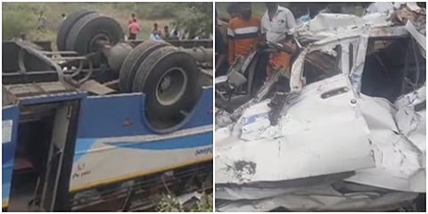 ಕಾರಿನ ಚಕ್ರ ಸ್ಫೋಟಗೊಂಡು ನಿಯಂತ್ರಣ ಕಳೆದುಕೊಂಡು ಸರ್ಕಾರಿ ಬಸ್ ಗೆ ಡಿಕ್ಕಿ ಹೊಡೆದಿದೆ. ಪರಿಣಾಮ ಕಾರು ಸಂಪೂರ್ಣ ನಜ್ಜು ಗುಜ್ಜಾಗಿದ್ದು, ಬಸ್ ಕೂಡಾ ಉರುಳಿ ಬಿದ್ದಿದೆ. ಈ ದುರ್ಘಟನೆಯಿಂದಾಗಿ ಐವರು ಸ್ಥಳದಲ್ಲಿಯೇ ಮೃತಪಟ್ಟಿದ್ದು, ಇತರ 34 ಮಂದಿ ಗಾಯಗೊಂಡಿದ್ದಾರೆ ಎಂದು ತಿರುಚ್ಚಿ ಜಿಲ್ಲಾ ಪೊಲೀಸ್ ವರಿಷ್ಠಾಧಿಕಾರಿ ಸುಜಿತ್ ಕುಮಾರ್ ತಿಳಿಸಿದ್ದಾರೆ.